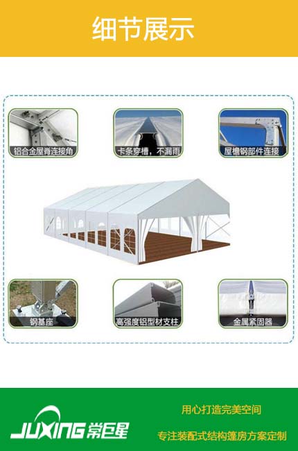 常巨星裝配式篷房提供種類豐富的活動(dòng)篷房出售,租賃服務(wù),可根據(jù)活動(dòng)規(guī)模大小制造合適的篷房尺寸,為各種商業(yè)展示活動(dòng),產(chǎn)品發(fā)布會(huì)和促銷活動(dòng),廣告宣傳等營造出別具一格的時(shí)尚活動(dòng)。公司現(xiàn)有篷房主體框架為中空鋁合金結(jié)構(gòu),連接部位為采用國家焊接鋼結(jié)構(gòu),可調(diào)節(jié)式基座可彌補(bǔ)場地的不平,篷房采用PVC篷布,該篷布具有不拉伸的良好性能,不透光,采用高頻焊接技術(shù),篷房抗風(fēng)能力達(dá)到80-100公里/小時(shí)。具有體積小,儲(chǔ)存方便,拆裝靈活快捷易運(yùn)輸?shù)忍攸c(diǎn),單位組合式結(jié)構(gòu),可根據(jù)場地的大小自由增加,對(duì)搭建場地?zé)o特殊要求,一般場地如草地、大理石地、瀝青地面、水泥地均可。篷房內(nèi)無支柱,場地空間得到利用。